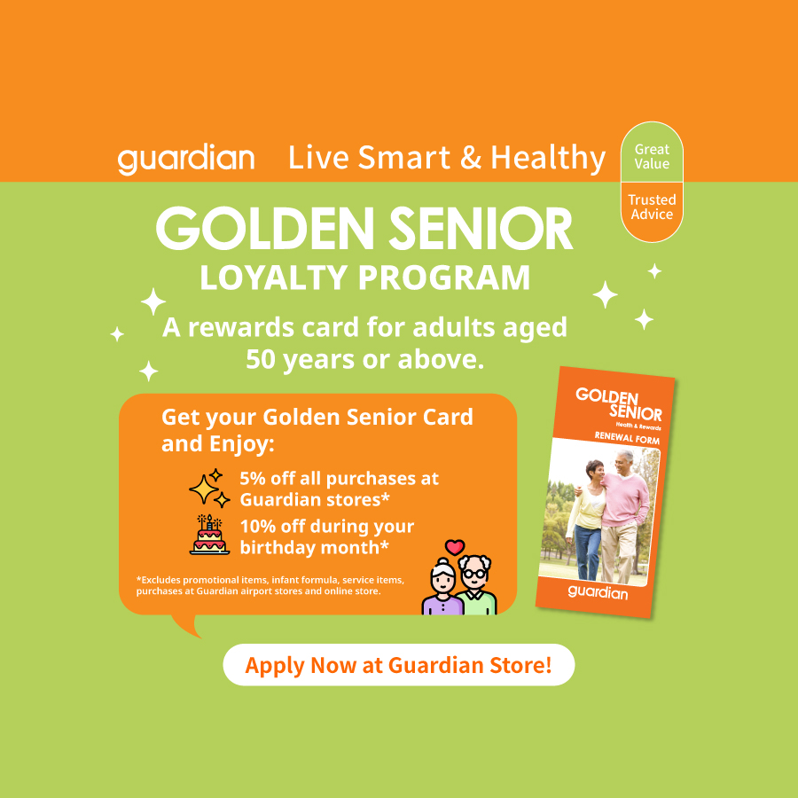Guardian Health and Beauty's Golden Senior Royalty Program is a rewards card for adults aged 50 years or above. Get your Golden Senior Card today in any Guardian store to enjoy the following exclusive privileges: